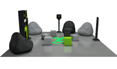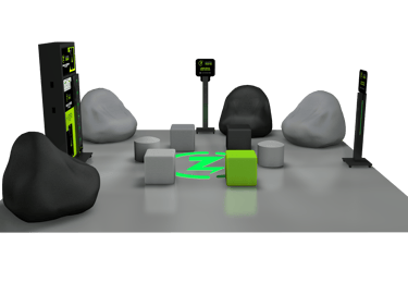Área indicada para instalação do lounge: 25m2 2 pufes redondos (na cor branca) 4 pufes quadrados (cores padrão: cinza claro e verde) 2 totens torre com aba e luzes LED RGB customizáveis 4 pufes pera (dois cinza claro e dois cinza escuro) 1 totem carregador de celular com adesivagem customizada para o contratante